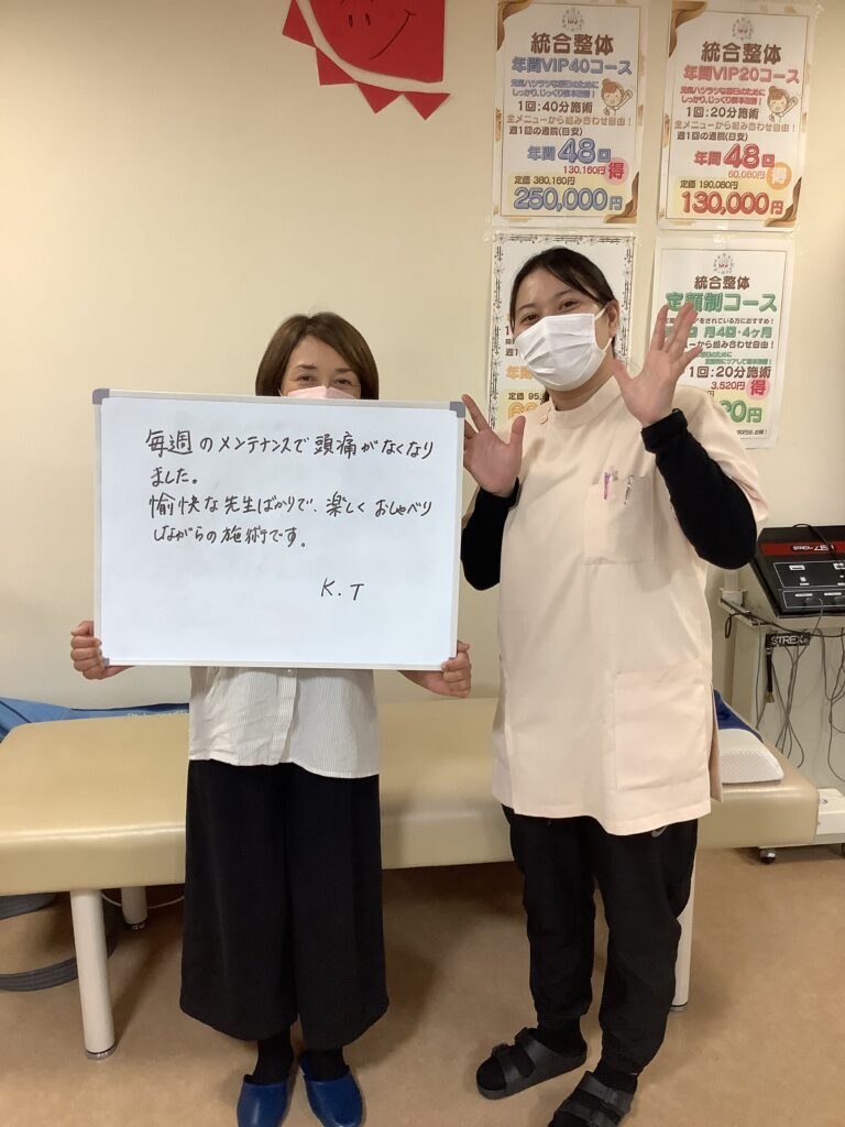 こんにちは!八幡東区にありますRe-Bone鍼灸整骨院です! 今回は現在ご通院頂いている患者さまからのお声をご紹介させて頂きます♪ 当院では普段のお仕事や家事などで首、肩の筋肉が硬くなりいわゆる肩こり、 首こりに悩まされている方、また筋肉の緊張から血行が滞り頭痛を 起こしている方は沢山いらっしゃいます。 お体の不調で仕事や家事に支障をきたしたり、趣味に打ち込めないなどの お悩みをお抱えの方は是非当院にいらしてください。 当院では国家資格所有の専門知識の豊富な施術者による問診、検査を行い 皆様の目標、願望を叶える施術を提供いたします。 気になる方は是非お気軽にご連絡下さい!