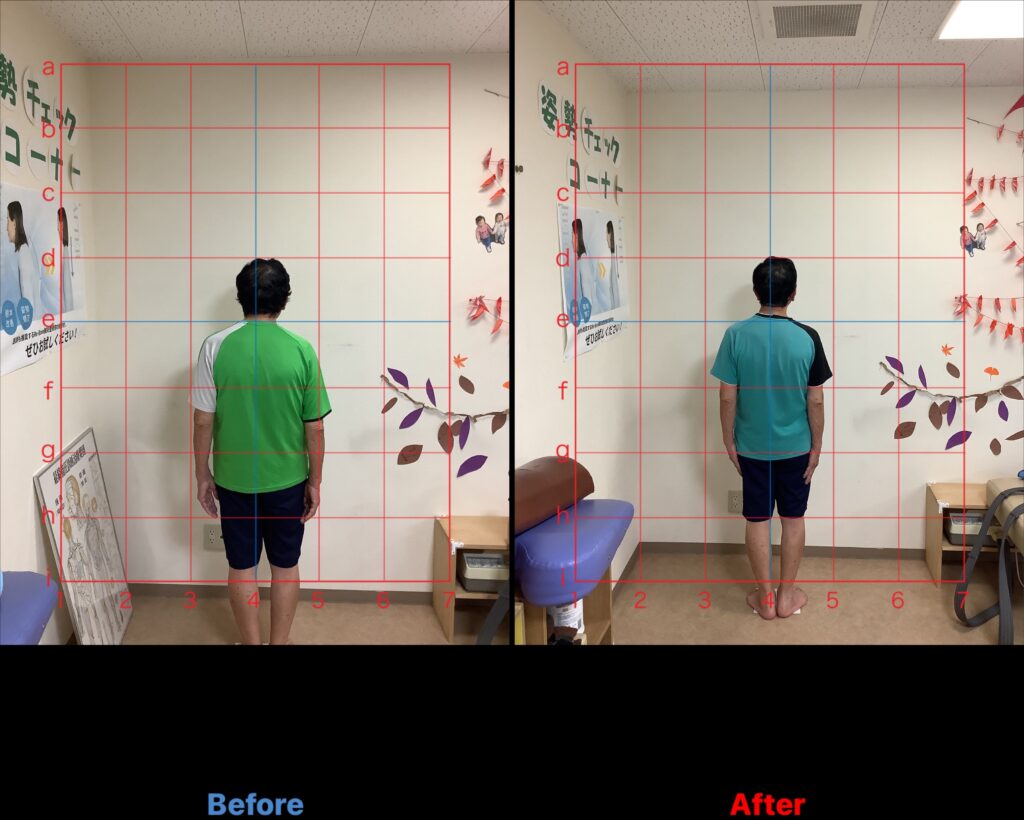 - 右(1ヶ月経過後): 背筋が伸び、頭を垂直に保持できる正しい位置へ改善。